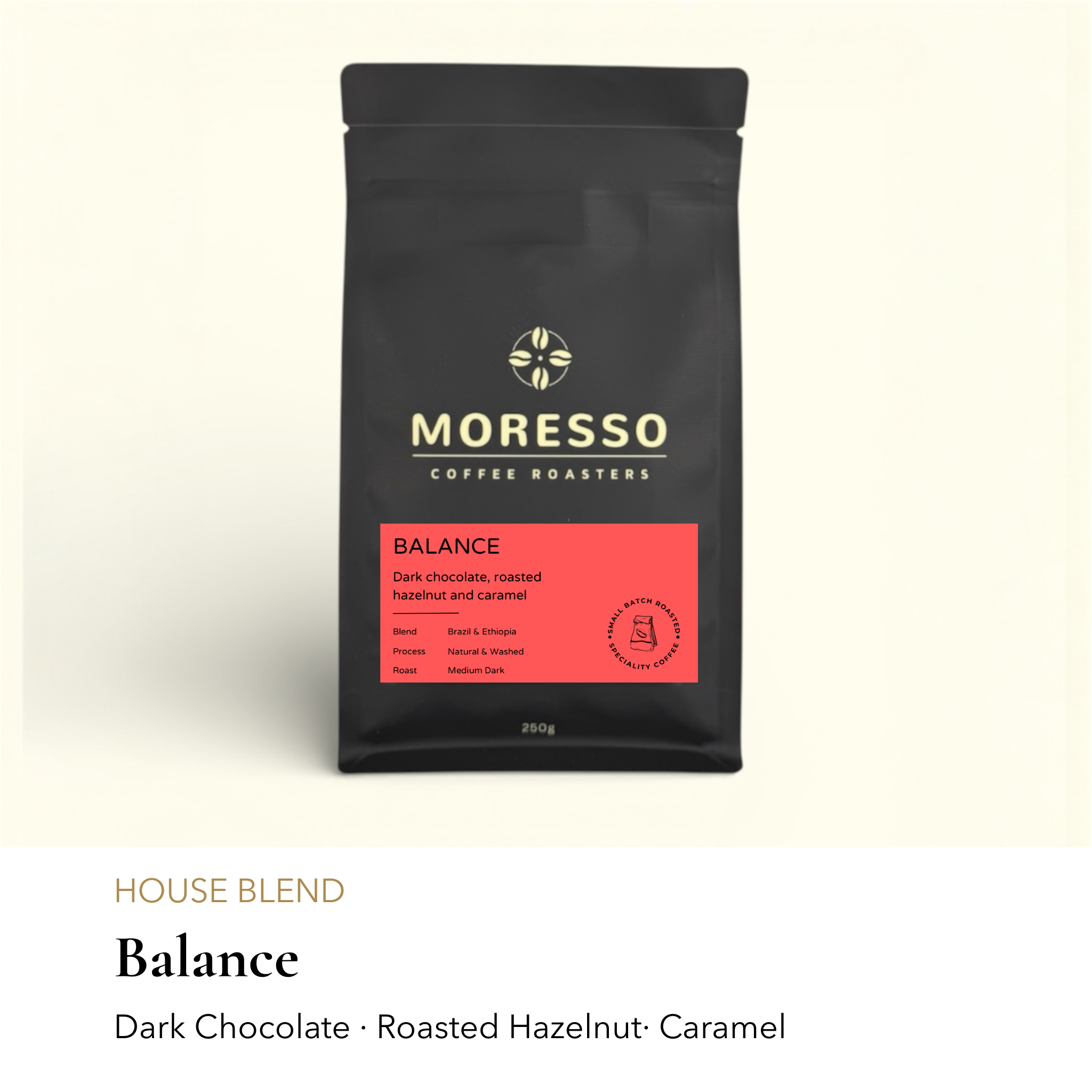 Balance is an espresso blend, crafted with high quality Arabica coffee beans.  It is medium dark roasted, has a well-balanced body and sweetness with rich chocolatey and nutty flavours.